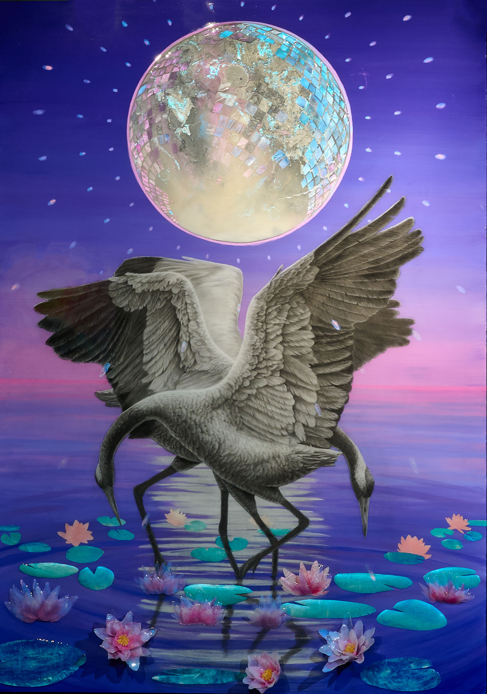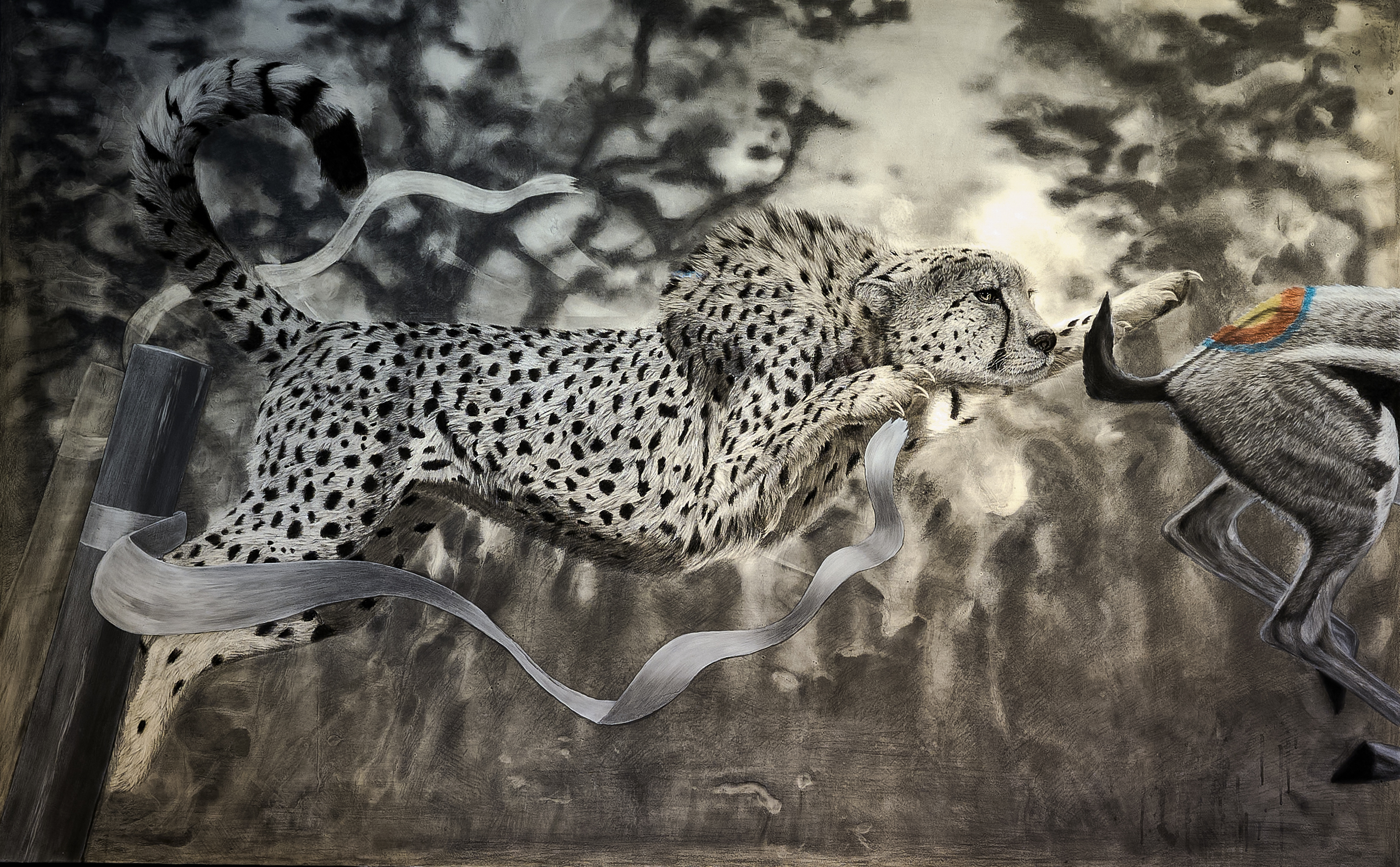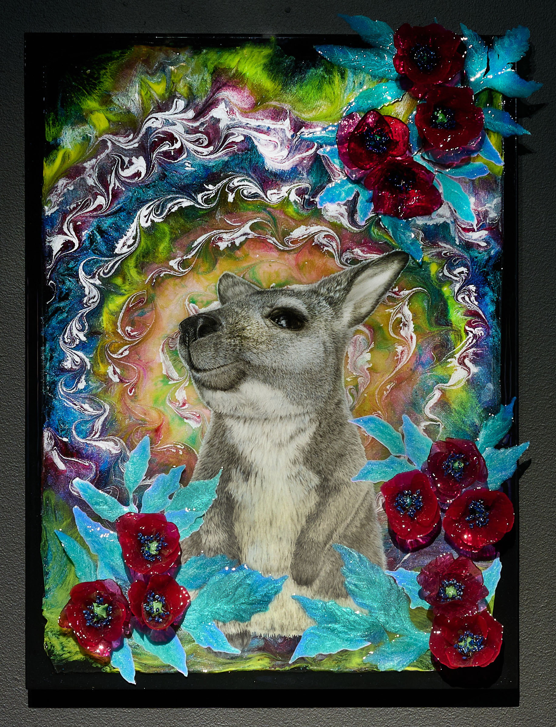 Hiili- ja lyijykynä, akryylimaali, hartsi, muste
