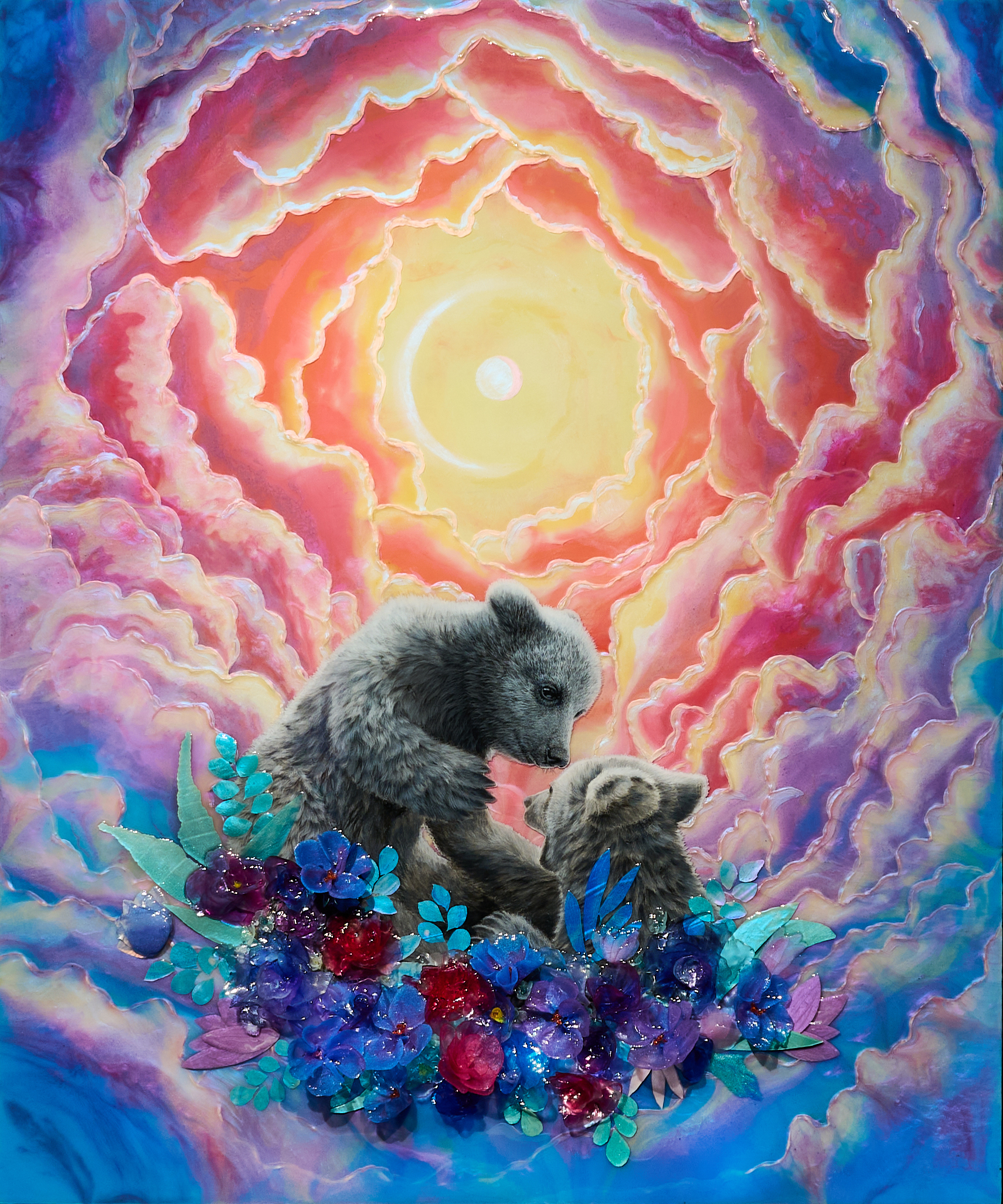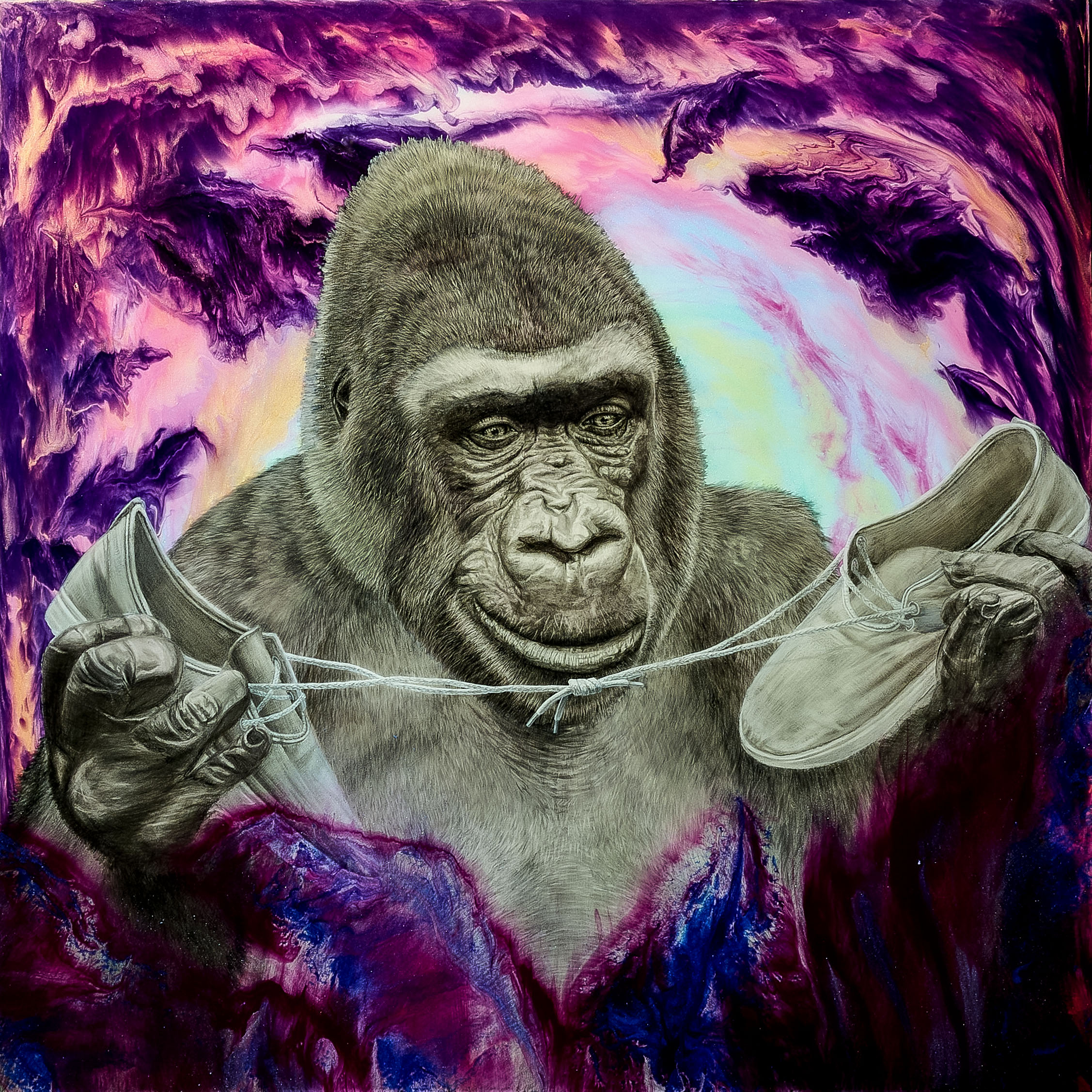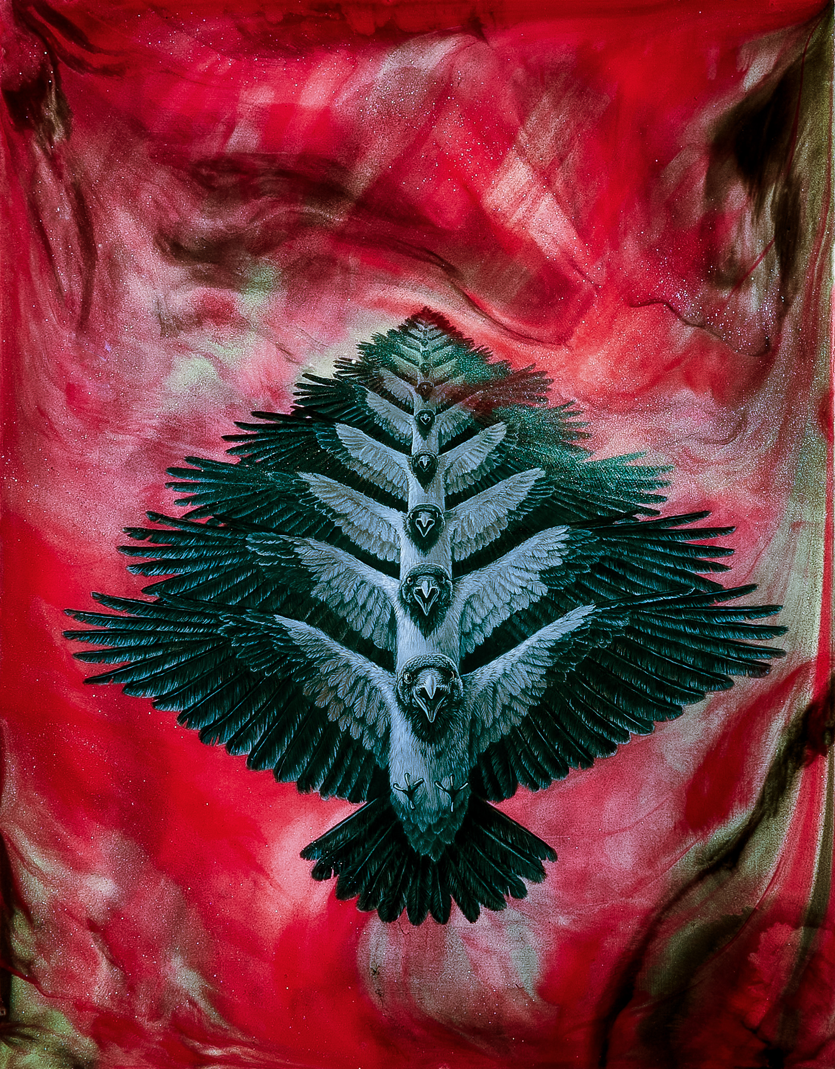 Hiili- ja lyijykynä, akryylimaali, hartsi, muste